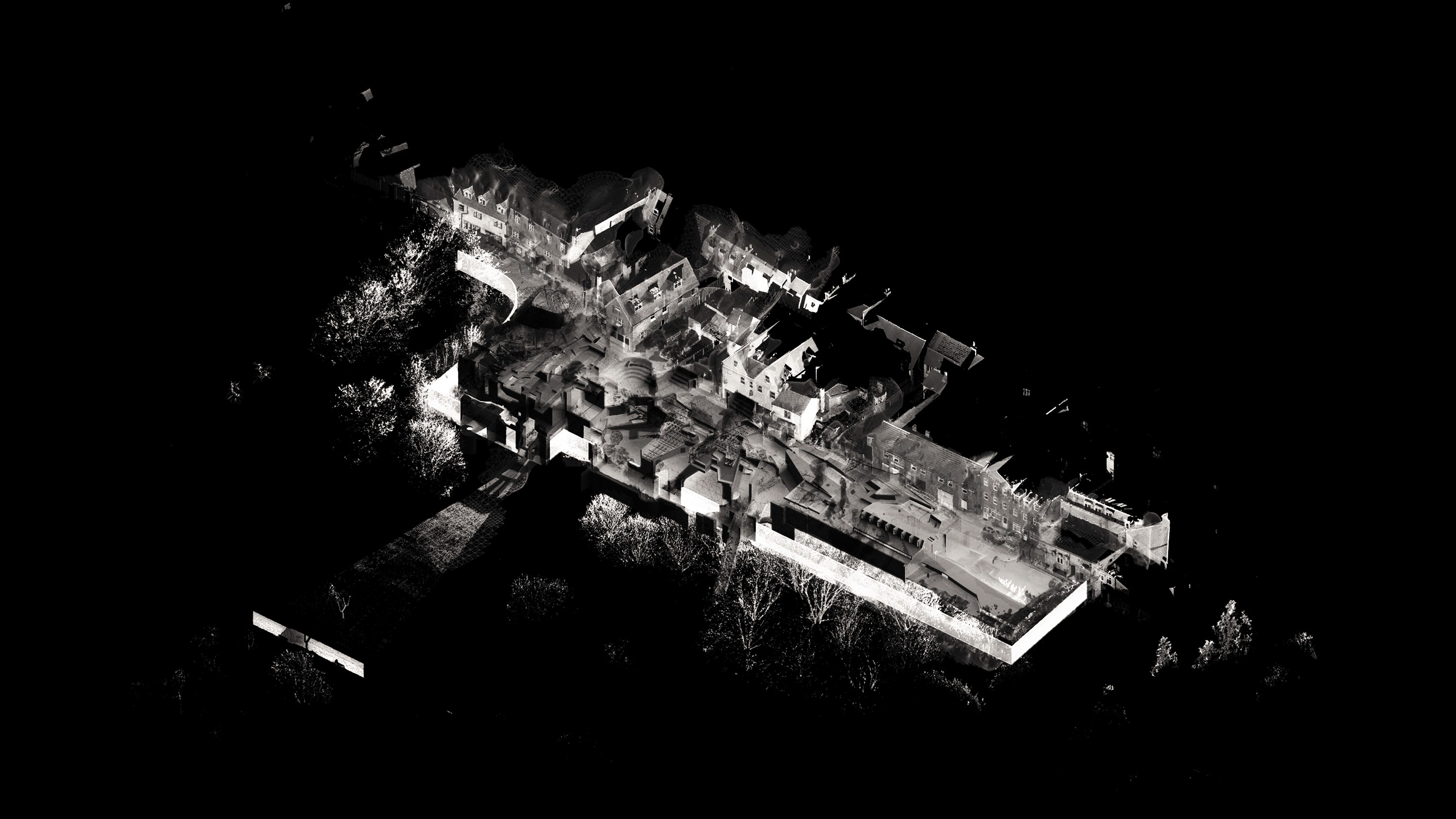 This project reimagines architectural surveying methods using a contentious conservation site at Waltham Abbey as its testing ground. Rather than employing LiDAR for precise geometric capture, scanning was restricted to eight positions, deliberately preserving imperfections, gaps, and edge noise. By controlling scanning intervals, the point cloud records the shifting interplay of light, shadow, and human movement over time, generating a processed, unstable version of the site.